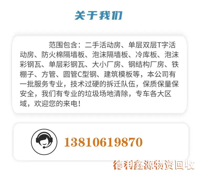 提供彩鋼房、活動房等回收拆除服務(wù),涵蓋廢舊設(shè)備、金屬、工業(yè)設(shè)備、電力設(shè)備、制冷設(shè)備、鋼結(jié)構(gòu)等。服務(wù)范圍覆蓋北京多區(qū)及周邊,可承包大跨度廠房等廢舊資產(chǎn)回收。